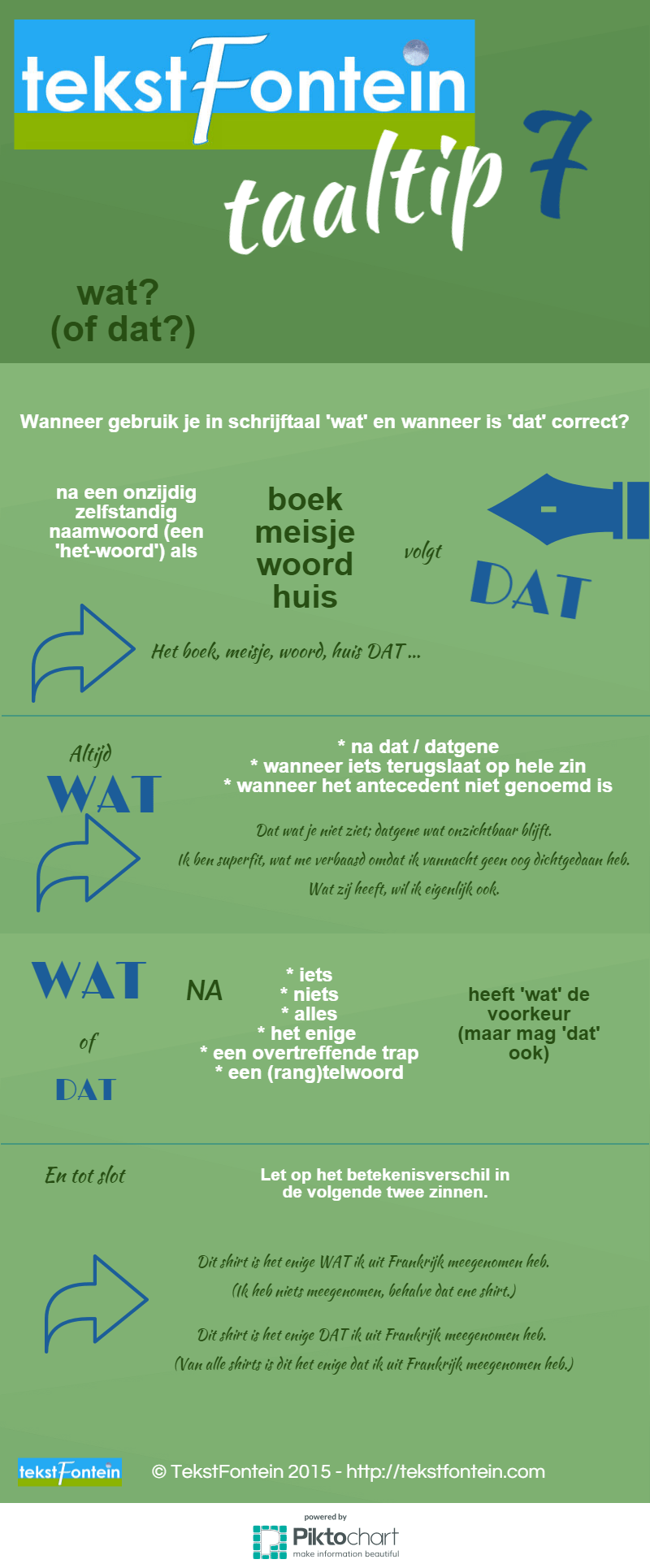‘Heb je ook een taaltip over het correcte gebruik van ‘wat’ en ‘dat’?’ vroeg iemand mij onlangs. ‘Nee,’ zei ik, maar ik voegde er snel ‘nog niet’, aan toe. En ik ging meteen aan de slag.